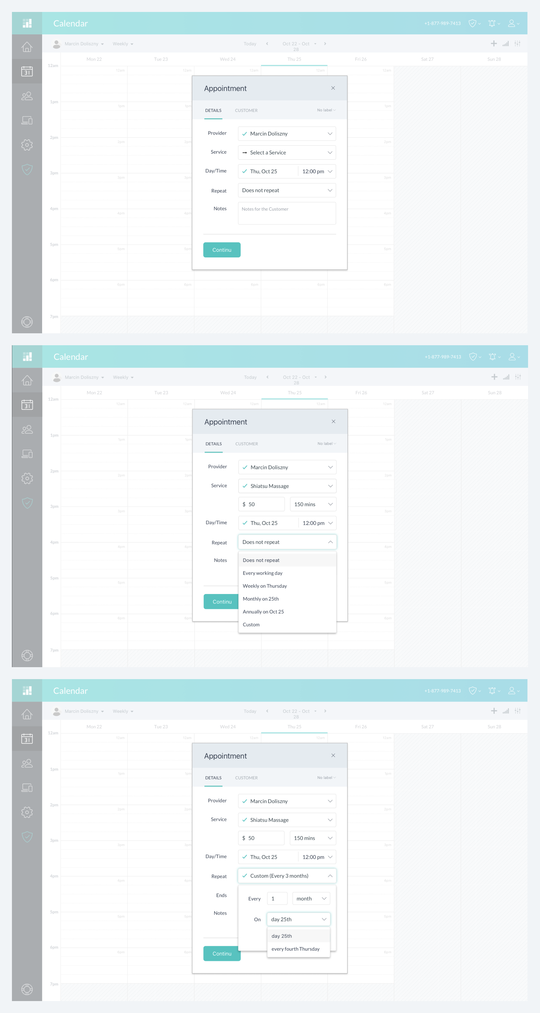 I explored multiple interaction models (single event → “make recurring”, dedicated recurring editor, and template-based scheduling). We chose a calendar-native approach: users create an appointment the way they already do, then turn it into a series with clear frequency rules and an explicit exceptions model (skip, reschedule, edit one vs edit series). This reduced learning cost and made the feature safe for busy operators.